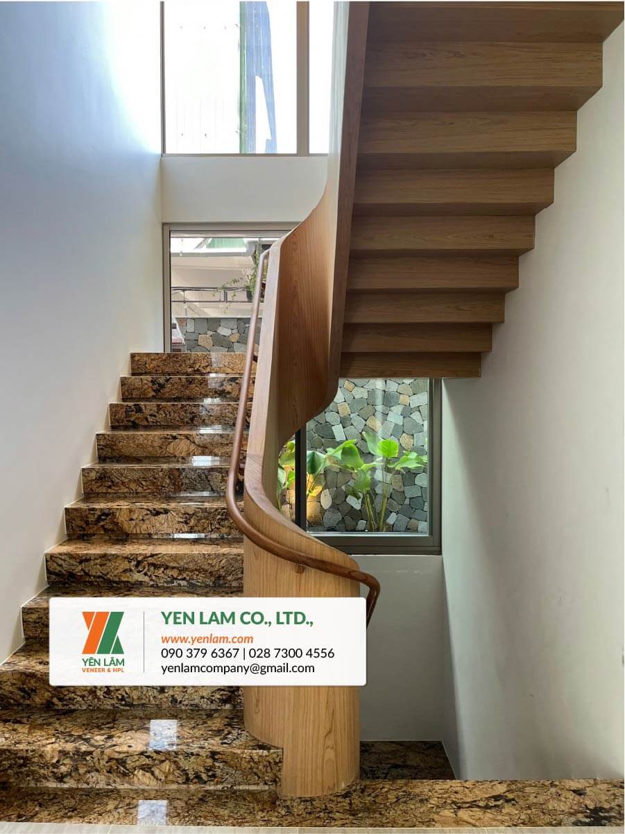 Cầu thanh sử dụng veneer teak kỹ thuật vô cùng sang trọng, hiện đại